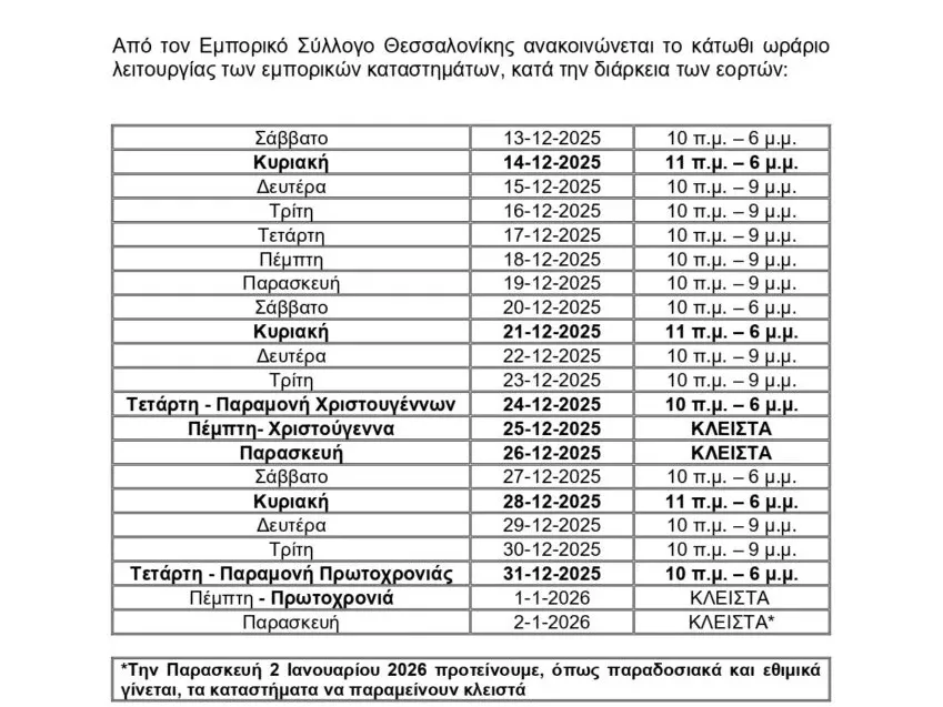Σύμφωνα με τον Εμπορικό Σύλλογο Θεσσαλονίκης, τα καταστήματα στην πόλη θα είναι ανοιχτά τις Κυριακές 14, 21 και 28 Δεκεμβρίου από τις 11 το πρωί έως τις 6 το απόγευμα.