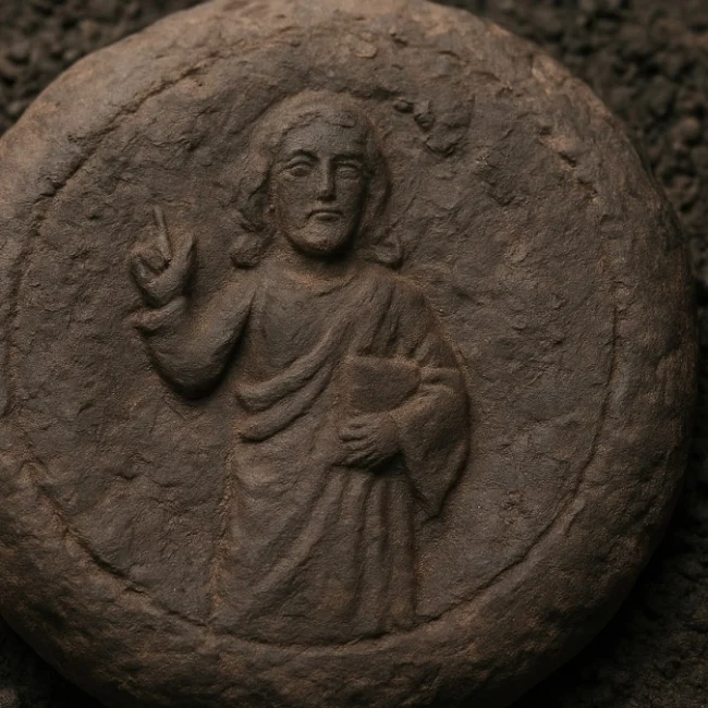 Ένα από τα ψωμιά ξεχωρίζει ιδιαίτερα καθώς φέρει μια εικόνα του Ιησού Χριστού συνοδευόμενη από ελληνική επιγραφή: «Με τις ευχαριστίες μας στον Ευλογημένο Ιησού». Όπως επισημαίνουν οι ειδικοί, η απεικόνιση αυτή διαφοροποιείται από την παραδοσιακή εικόνα του Παντοκράτορα, όπου ο Χριστός εμφανίζεται ως ηγεμόνας και σωτήρας. Στο ψωμί αυτό, ο Χριστός φαίνεται πιο «γήινος», ως χωρικός, συνδέοντας την πίστη με την εργασία και τη γεωργική γονιμότητα.