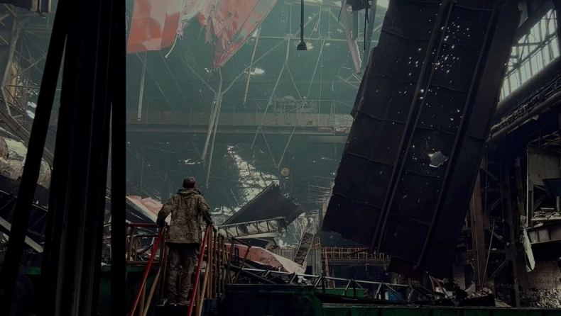 Στο βίντεο μπορείτε να δείτε το εργοστάσιο από μέσα, που καταστράφηκε από ρωσικές βόμβες, από συνεχείς βομβαρδισμούς του πυροβολικού και ρουκέτες από τη θάλασσα. Στριφτές μεταλλικές ράβδοι, πηχάκια, διάφορες κατεστραμμένες βιομηχανικές κατασκευές και ο ανοιχτός ουρανός είναι ορατός στις τρύπες της βομβαρδισμένης βιομηχανικής κατασκευής.