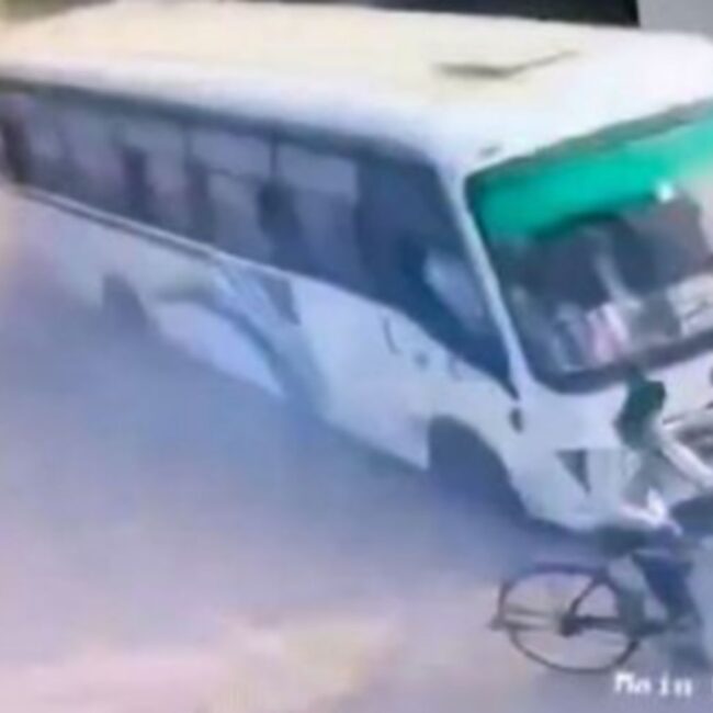 Ποδηλάτης αποφεύγει στο παρά πέντε λεωφορείο που χάνει τον έλεγχο, σπάει πύλη και χτυπά πεζό με ταχύτητα. Δείτε: