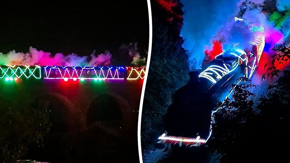 Ένα φωταγωγημένο τρένο ταξιδεύει στην ακτογραμμή του South Devon, οδηγώντας τους επιβάτες σε μια σύντομη περιήγηση στο Kingswear και μια ζεστή, γιορτινή επιστροφή.