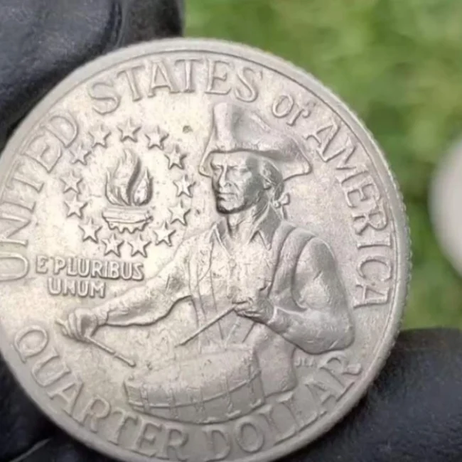 Το συγκεκριμένο ασημένιο Bicentennial Quarter διαθέτει σπάνιο διπλό τύπωμα, ένα λάθος κατά την παραγωγή που οδηγεί σε διπλές, ελαφρώς μετατοπισμένες εγχαράξεις στην επιφάνεια του νομίσματος.