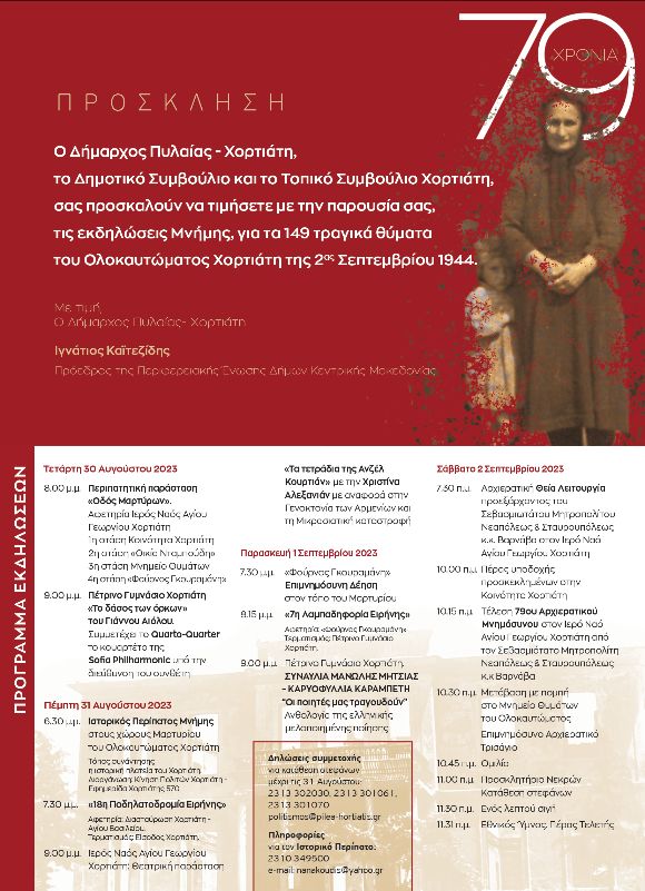 6.30 μ.μ.: Ιστορικός Περίπατος Μνήμης στους χώρους του Μαρτυρίου του Ολοκαυτώματος Χορτιάτη. Τόπος συνάντησης η ιστορική πλατεία του Χορτιάτη. Διοργάνωση: Κίνηση Πολιτών Χορτιάτη – Εφημερίδα Χορτιάτης 570.