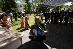 Συνοδευόμενη από την Περιφερειακή Σύμβουλο Νατάσα Σωτηριάδου, η κ. Αηδονά παρέστη στη Θεία Λειτουργία και στο μνημόσυνο, στον Ιερό Ναό Μεταμορφώσεως του Σωτήρος Νέας Σάντας, και στη συνέχεια στην επιμνημόσυνη δέηση, που τελέστηκε στον χώρο του μνημείου, στην πλατεία Παλικαριών, όπου και κατέθεσε στεφάνι στη μνήμη των θυμάτων της Γενοκτονίας.