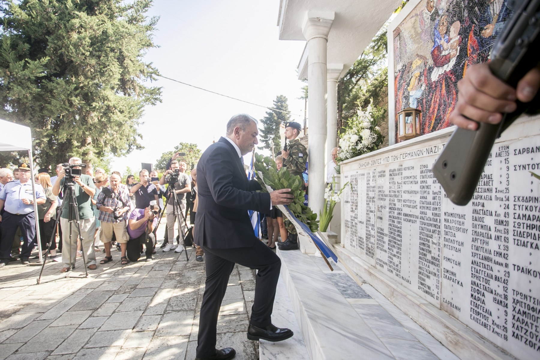 Στη συνέχεια επακολούθησε η κατάθεση στεφανιών από τους επισήμους και σιγή ενός λεπτού στη Μνήμη των Θυμάτων και ο Εθνικός Ύμνος. Στις εκδηλώσεις συμμετείχαν μεταξύ των άλλων ο Υφυπουργός Εσωτερικών Κωνσταντίνος Γκιουλέκας ως εκπρόσωπος της Κυβέρνησης, ο βουλευτής Θεοφάνης Παπάς ως εκπρόσωπος του Προέδρου της Βουλής, ο βουλευτής Σωκράτης Φάμελλος ως εκπρόσωπος του ΣΥΡΙΖΑ – Προοδευτική Συμμαχία, βουλευτές, ο Διοικητής του Γ΄ΣΣ/ NRDC- GR Αντιστράτηγος Γαρίνης Αθανάσιος, Στρατιωτικές κλπ Αρχές, ο Πρόεδρος της ΚΕΔΕ και Δήμαρχος Αμπελοκήπων Μενεμένης Λάζαρος Κυρίζογλου, Δήμαρχοι, εκπρόσωποι Μαρτυρικών Δήμων με επικεφαλή τον Δήμαρχο Καλαβρύτων Αθανάσιο Παπαδόπουλο, Προξενικές Αρχές, ο Αντιπεριφερειάρχης Σωκράτης Δωρής ως εκπρόσωπος του Περιφερειάρχη Απόστολου Τζιτζικώστα, εκπρόσωποι συλλόγων οικογενειών θυμάτων Ολοκαυτώματος και πλήθος κόσμου.