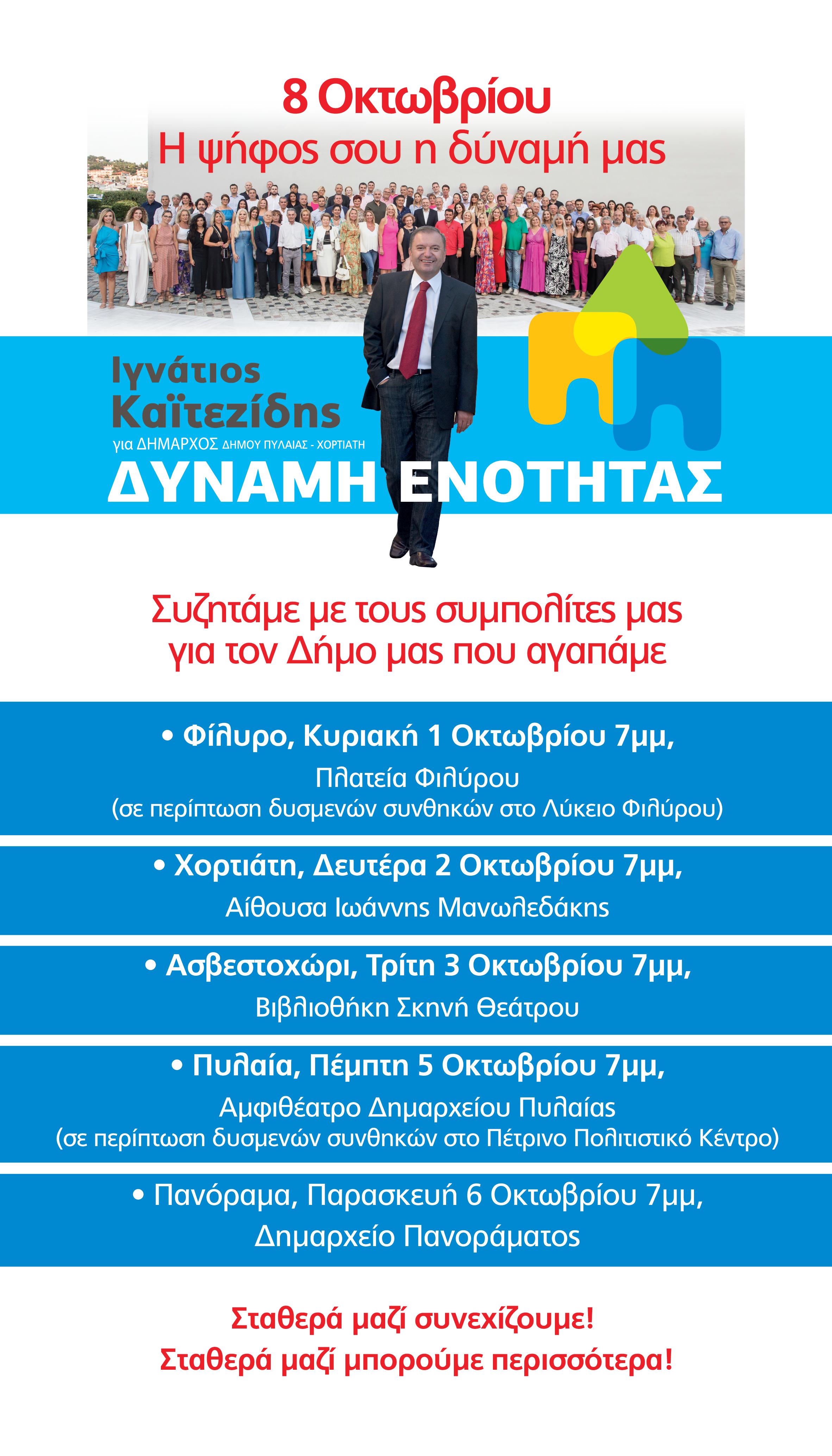 Ο κ. Καϊτεζίδης και επικεφαλής της παράταξης «Δύναμη Ενότητας», μαζί με τους συνεργάτες του, θα έχει την ευκαιρία να συνομιλήσει με τους πολίτες στο Φίλυρο, τον Χορτιάτη, το Ασβεστοχώρι – Εξοχή, την Πυλαία και το Πανόραμα.