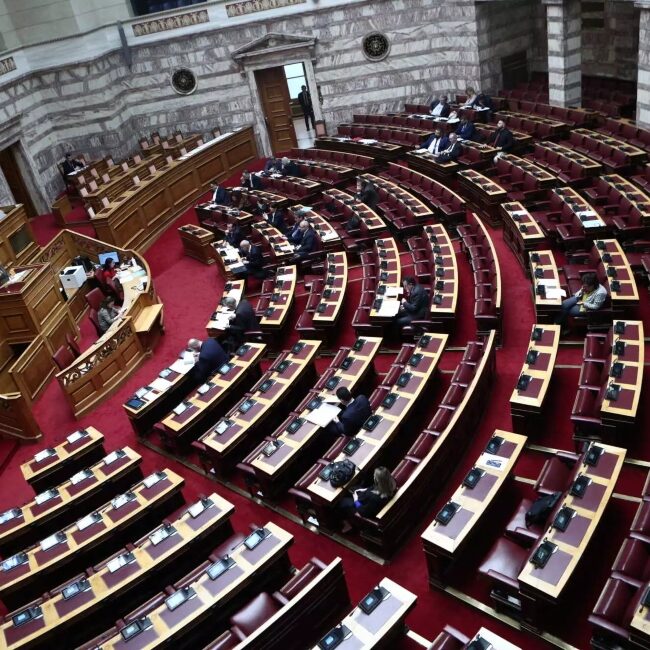 Βουλή: Φωταγωγήθηκε το Κοινοβουλίο για την ημέρα ενάντια στην έμφυλη βία κατά των γυναικών