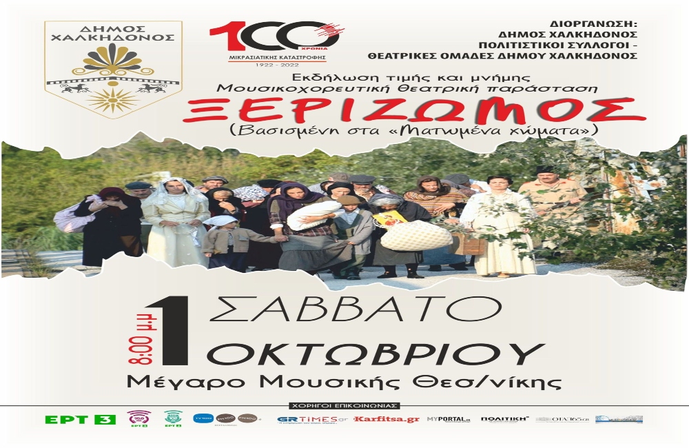 Μια μεγαλειώδης μουσικοχορευτική θεατρική παράσταση με τίτλο “Ξεριζωμός” διοργανώνει το Σάββατο 1 Οκτωβρίου 2022 στις 8 το βράδυ στο Μέγαρο Μουσικής Θεσσαλονίκης ο Δήμος Χαλκηδόνος σε συνεργασία με τους πολιτιστικούς συλλόγους και τις θεατρικές ομάδες του Δήμου.