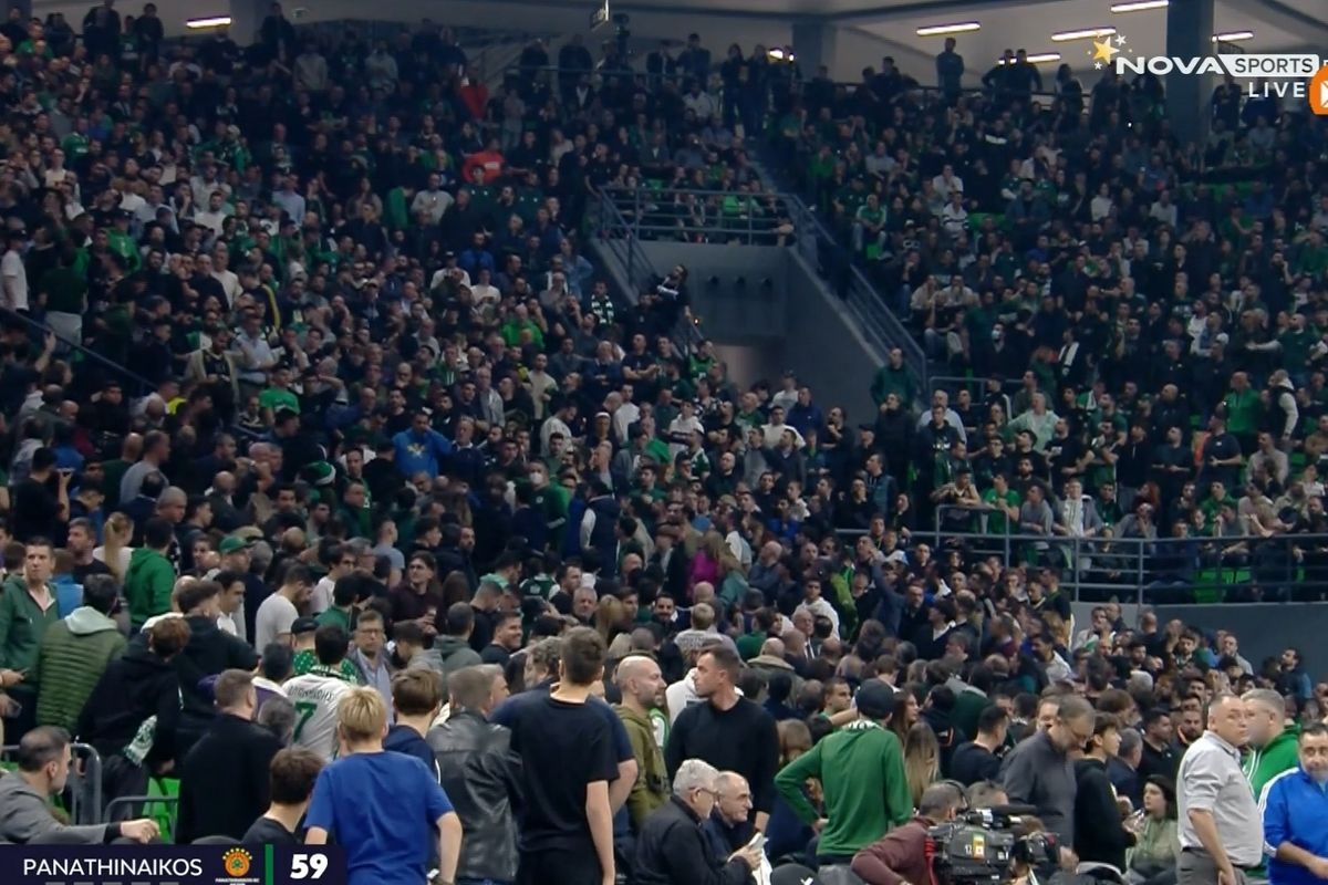 Ο αγώνας διεκόπη στα 8:29 καθώς όπως φαίνεται υπάρχει πρόβλημα υγείας με κάποιον φίλαθλο στην κερκίδα. Όλος ο κόσμος έστρεψε το βλέμμα του σε εκείνο το σημείο και άμεσα έσπευσε ιατρική βοήθεια.