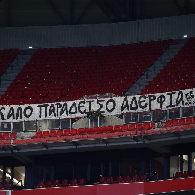 «Καλό παράδεισο αδέρφια», ανέγραφε το μήνυμα στην κερκίδα που προοριζόταν για να φιλοξενήσει τους φίλους του ΠΑΟΚ.