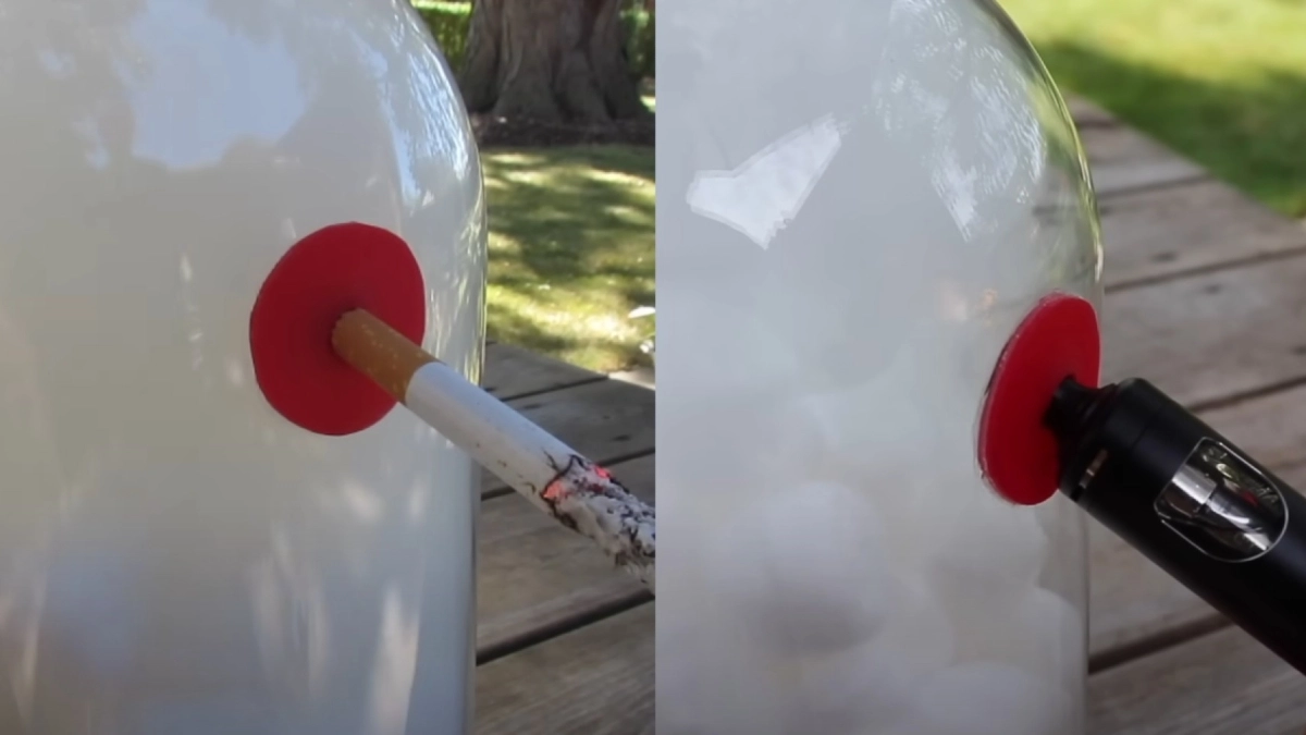 Το βίντεο του YouTuber Chris Notap παρουσιάζει τι εισπνέει το σώμα μας όταν καπνίζουμε και όταν ατμίζουμε για διάστημα ενός μήνα. Το αποτέλεσμα; Μπαλάκια βαμβακιού μέσα σε θόλο απορρόφησης καπνού έγιναν βαθύ καφέ από τα τσιγάρα, ενώ από το άτμισμα έμειναν σχεδόν λευκά, με ελάχιστο αποχρωματισμό.