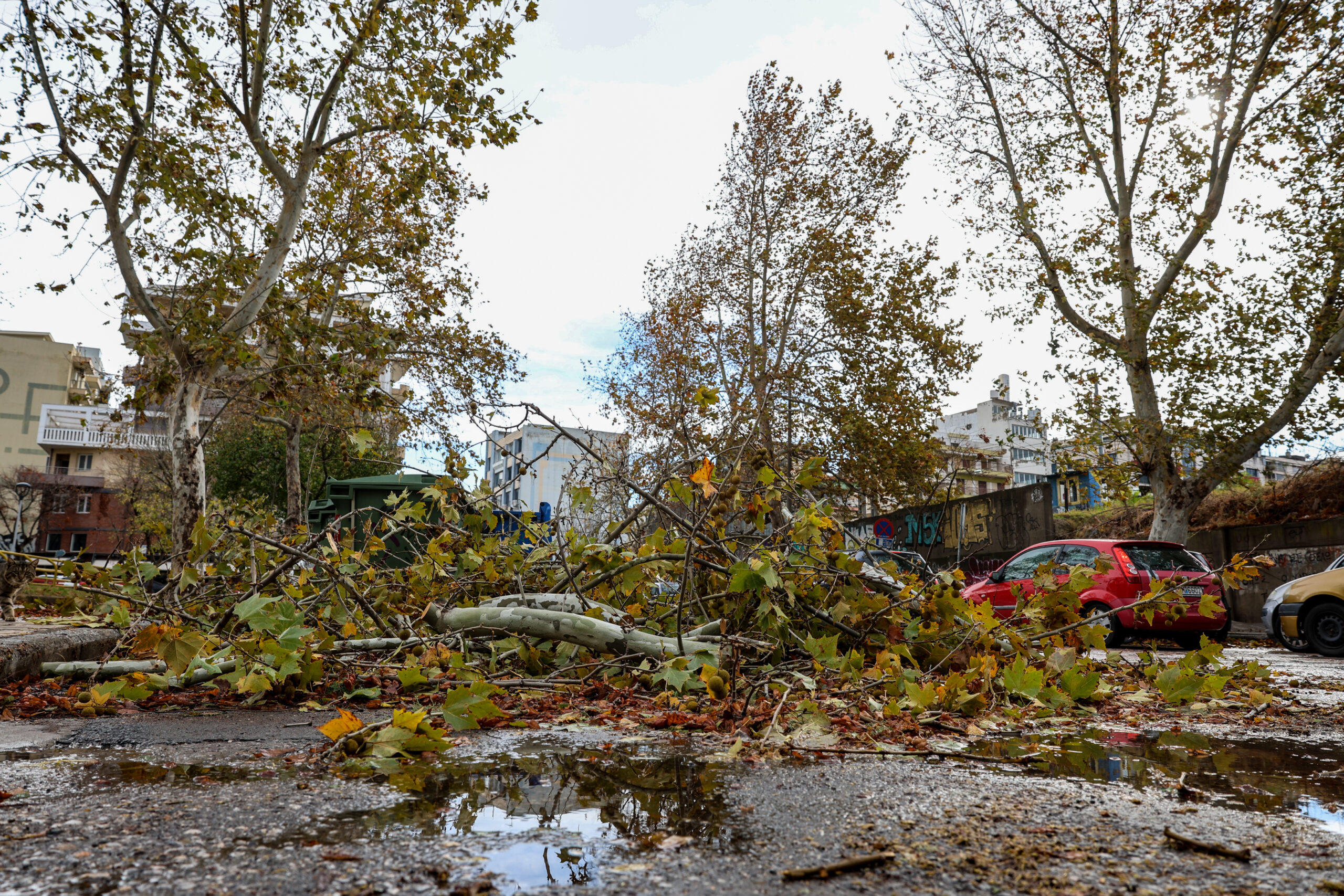 Η κακοκαιρία χτύπησε και τη Θεσσαλονίκη, ενώ ξεριζωμένα δέντρα βρίσκονται ακόμα και στο κέντρο της πόλης.