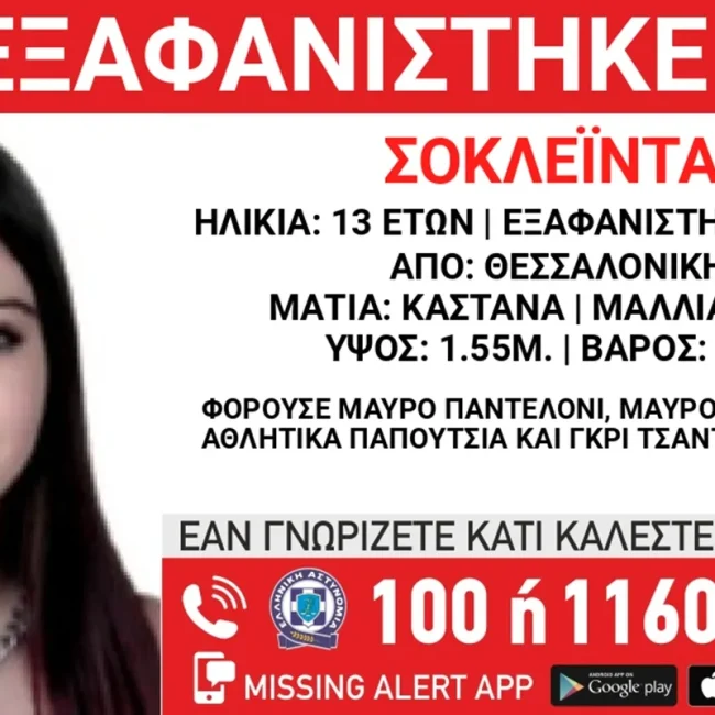 Εξαφάνιση 13χρονης στη Θεσσαλονίκη – Συναγερμός από «Το Χαμόγελο του Παιδιού»