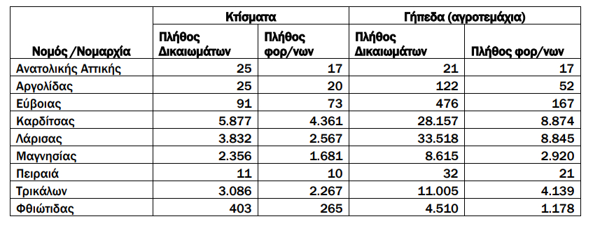 Με βάση τις αιτήσεις απαλλαγής που υποβλήθηκαν στην πλατφόρμα Αρωγή (arogi.gov.gr), η ΑΑΔΕ προχώρησε συνολικά σε απαλλαγές από τον ΕΝΦΙΑ 2024 σε 11.230 ΑΦΜ, για 15.706 δικαιώματα ιδιοκτησίας επί κτιρίων μετά του αναλογούντος οικοπέδου και σε 25.432 ΑΦΜ για 86.456 δικαιώματα ιδιοκτησίας επί αγροτεμαχίων.