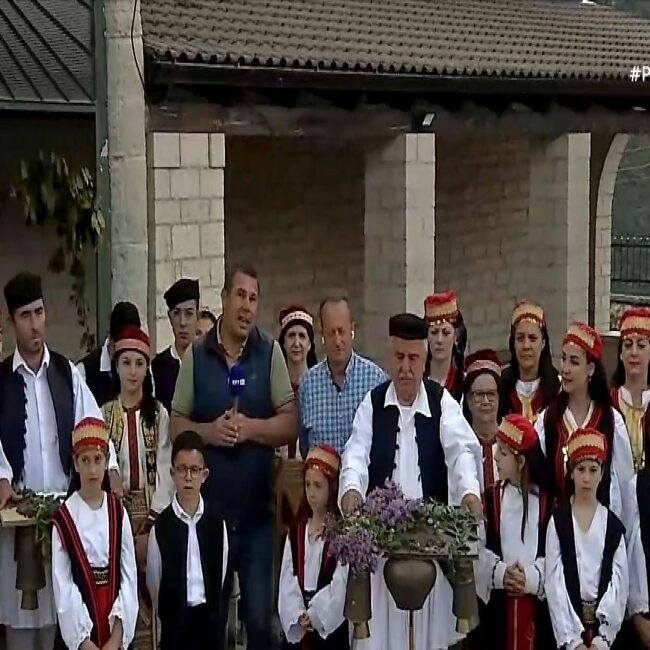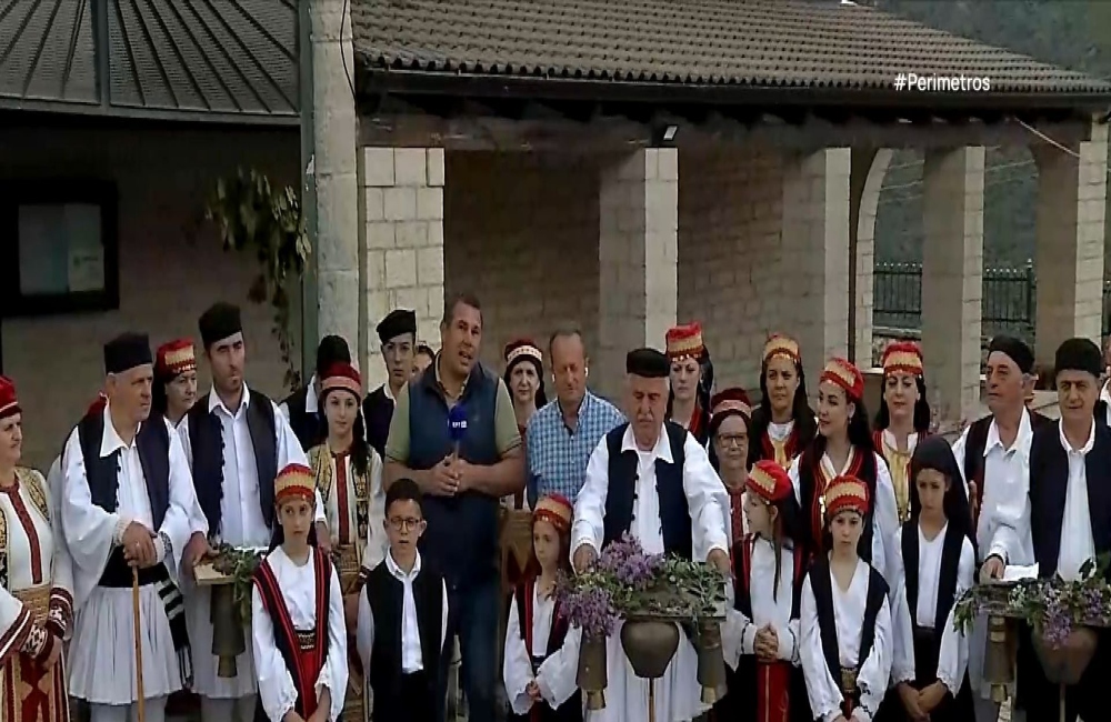 Άνδρες, γυναίκες και μικρά παιδιά, με παραδοσιακές στολές τραγουδούν πένθιμα τα κάλαντα της Μεγάλης Παρασκευής.
