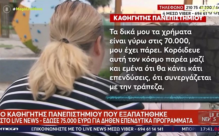 Καθηγητής πανεπιστημίου καταγγέλει στο MEGA πως κι εκείνος έπεσε θύμα της 45χρονης, όταν της εμπιστεύτηκε 70.000 ευρώ για επενδύσεις. Η 45χρονη του είχε υποσχεθεί ένα μεγάλο επενδυτικό πρόγραμμα, που θα του έφερνε τα διπλάσια χρήματα σε λιγότερο από 3 μήνες