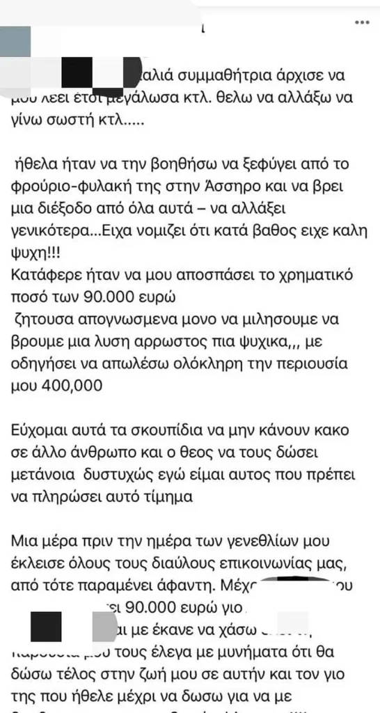 Στο ηλεκτρονικό σημείωμα, ο 40χρονος εξηγεί ότι η γυναίκα την οποία αγάπησε και της δόθηκε ολοκληρωτικά, απέσπασε μισό εκατομμύριο ευρώ από τον τραπεζικό του λογαριασμό. Ο ίδιος αναφέρει ότι την είχε εμπιστευθεί και της είχε δώσει τους κωδικούς του. Ο 40χρονος προπονητής αναφέρει ότι θα μπορούσε να αντιμετωπίσει την οικονομική αφαίμαξη, ωστόσο δεν μπόρεσε να αντέξει το γεγονός ότι η αγαπημένη του έχασε το ενδιαφέρον της για εκείνον, όταν τα χρήματά του είχαν τελειώσει.