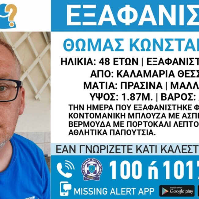 Σύμφωνα με ενημέρωση του Χαμόγελου του Παιδιού, στις 9 Απριλίου 2026, εξαφανίστηκε από την περιοχή της Καλαμαριάς στη Θεσσαλονίκη ο Θωμάς Κωνσταντινίδης, 48 ετών. Το «Χαμόγελο του Παιδιού» ενημερώθηκε για την εξαφάνιση του και προχώρησε, κατόπιν αιτήματος της οικογένειάς του, στη δημοσιοποίηση των στοιχείων του, καθώς ενδέχεται να συντρέχουν λόγοι, οι οποίοι θέτουν τη ζωή του σε κίνδυνο.