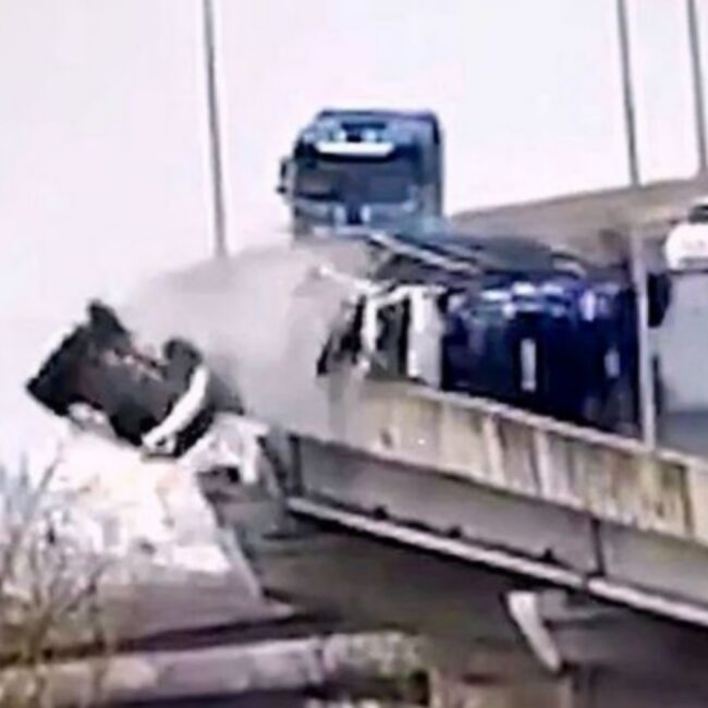 Φορτηγό που μετέφερε ολοκαίνουρια αυτοκίνητα στο Πόρτο Αλέγκρε της Βραζιλίας, τουμπάρισε σε στροφή γέφυρας. Δραματικά πλάνα κατέγραψαν την πορεία του φορτηγού που έχασε τον έλεγχο πάνω σε κλειστή στροφή με αποτέλεσμα ένα από τα αυτοκίνητα που μετέφερε να φύγει πετώντας και τα υπόλοιπα να υποστούν σοβαρές ζημιές. Ευτυχώς όμως, κανείς δεν τραυματίστηκε σοβαρά!